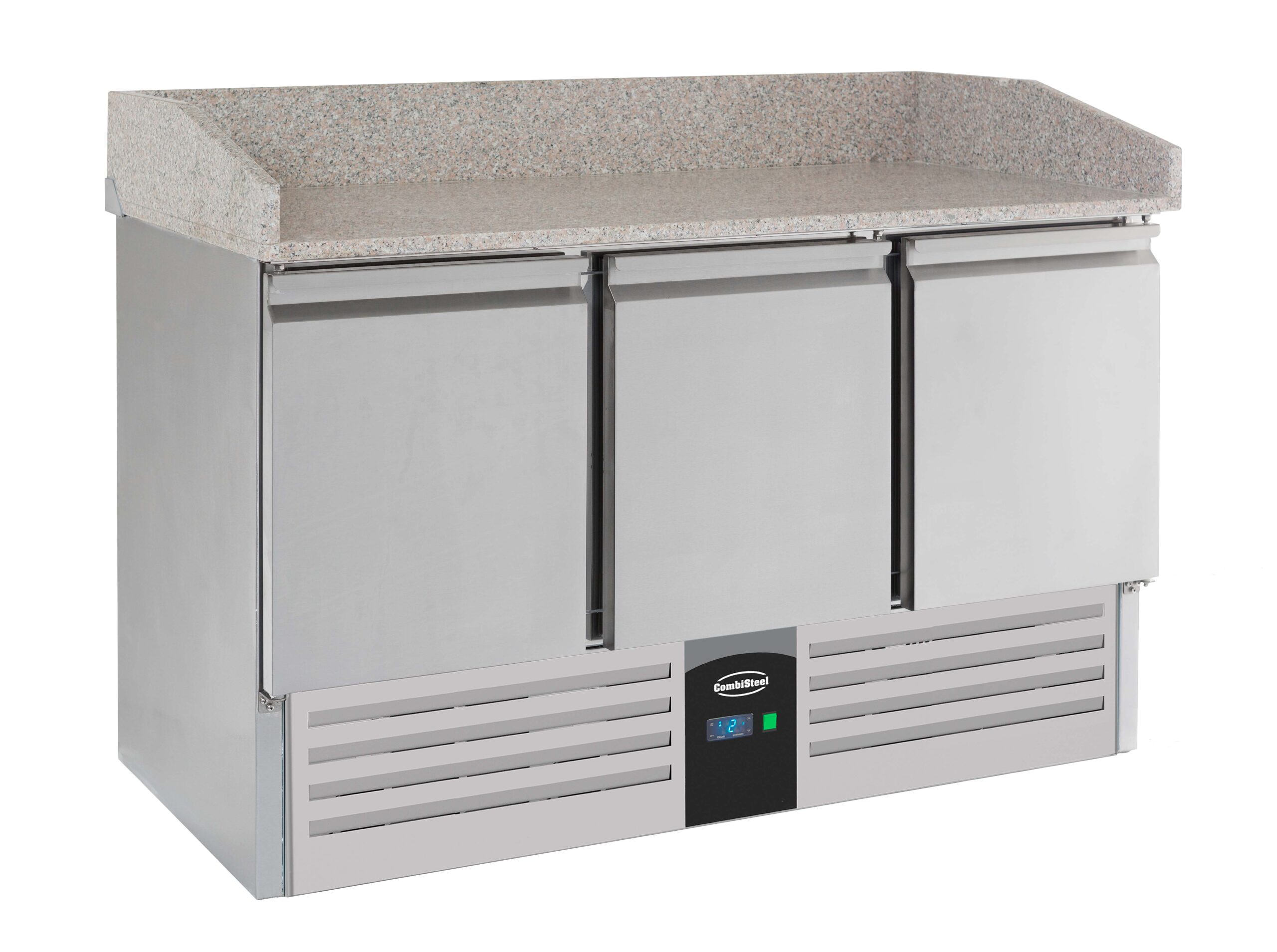 Dieser professionelle Pizzatisch mit 3 Türen vereint gekühlten Stauraum und Arbeitsfläche in einem Gerät. Die Arbeitsplatte aus Granit ist ideal zum Ausrollen von Teig – glatt, hygienisch und widerstandsfähig gegen intensiven täglichen Gebrauch. Unter der Arbeitsfläche befinden sich drei großzügige Kühlfächer zur optimalen Lagerung von Zutaten, Teiglingen und Soßen. Maße 1400x700x1020 mm (BxTxH) – Leistung 0,34 kW – Temperaturbereich +2/+8 °C – Nutzinhalt 230 Liter – Gewicht 95 kg – geeignet für 3x GN 1/1